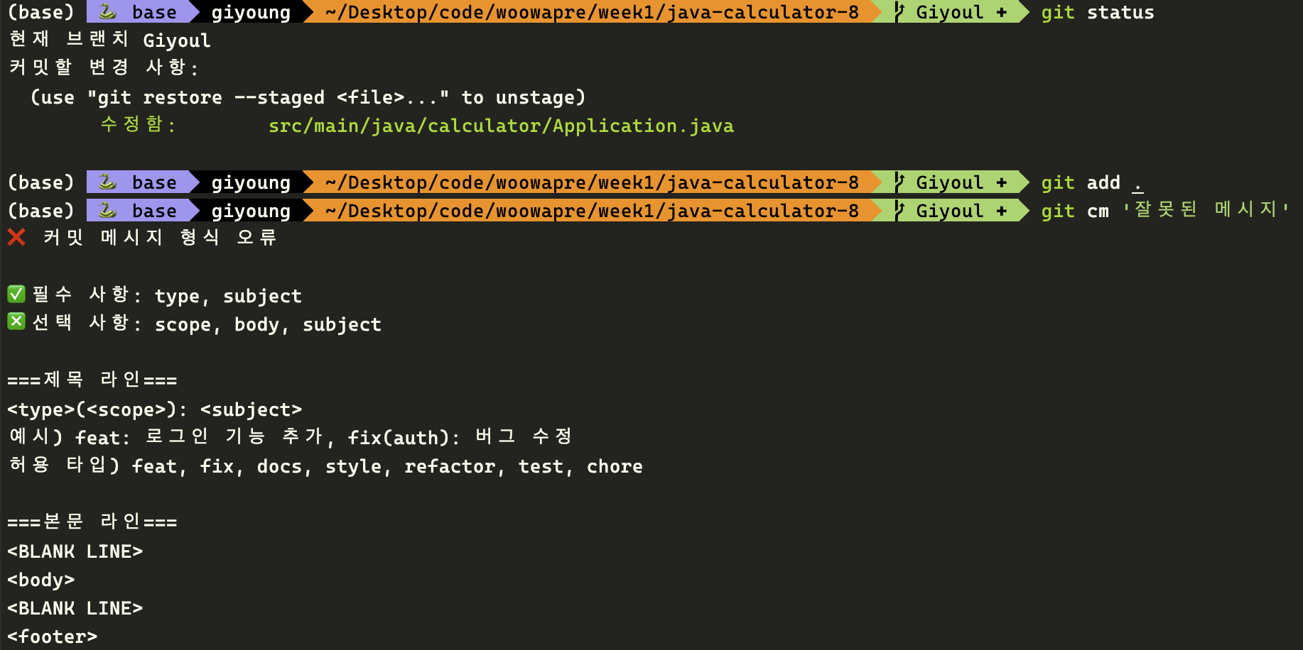 제대로 된 형식의 커밋 메세지도 잘.. 됩니다...