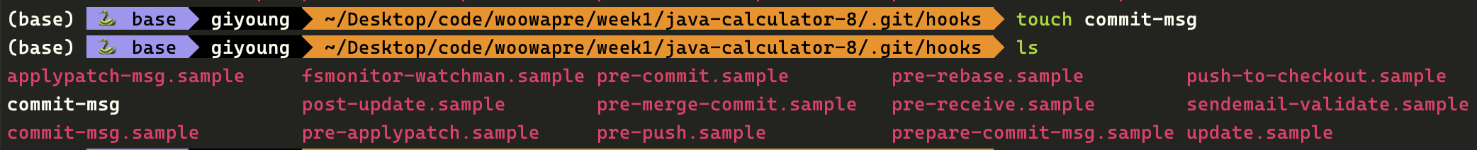 지금 우리가 건드려야 할 파일은 commit-msg이니 해당 파일을 새로 생성해주었습니다.