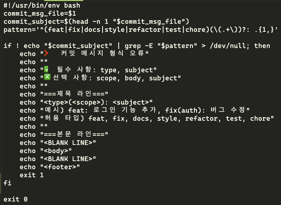 - 역할 : 커밋 메시지 템플릿 같은 자동으로 생성된 초기 메시지 내용을 편집하는 데 사용된다. (ex. 브랜치 이름 기반 이슈 번호를 메시지에 자동 추가) - commit-msg (메시지 최종 검증)